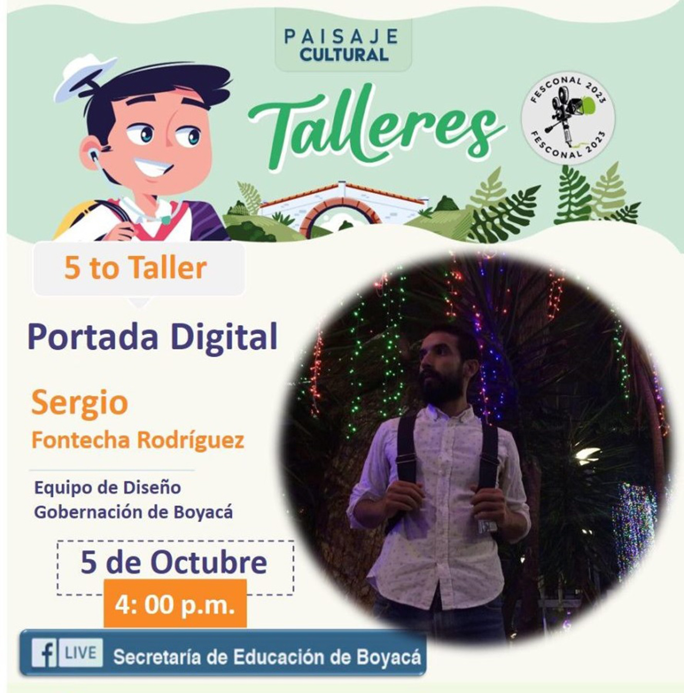 Con la participación de Sergio Fontecha Rodríguez, integrante del equipo de diseño de la Gobernación de Boyacá, se realizará el taller “Portada Digital” por las redes sociales de la Secretaría de Educación Facebook y Youtube, este 5 de octubre, a partir de las 4:00 de la tarde.