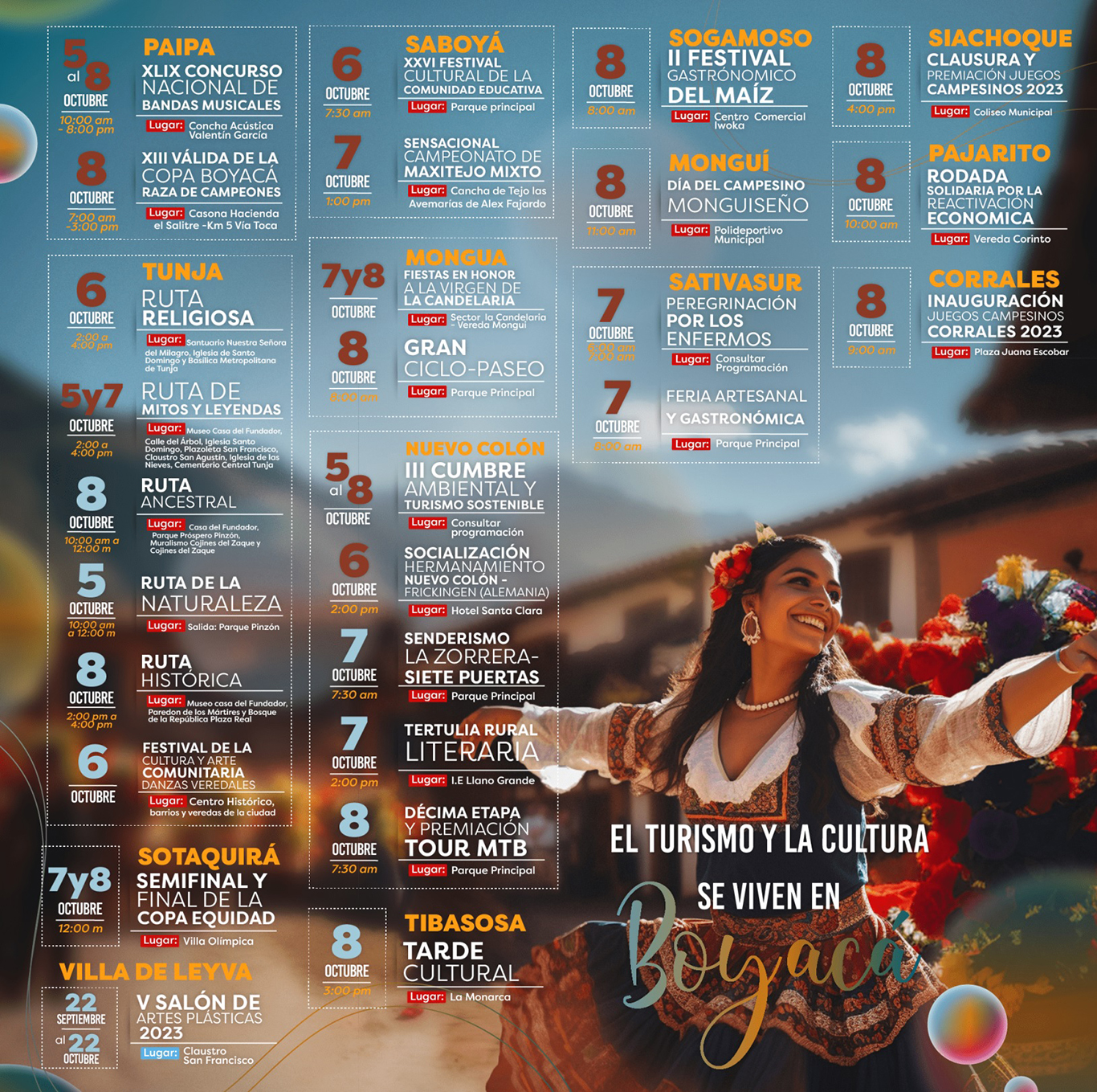 Del 5 al 9 de octubre el Departamento festejará sus tradiciones mediante expresiones culturales, en Paipa, Tunja, Sotaquirá, Saboyá, Mongua, Nuevo Colón, Tibasosa, Sogamoso, Monguí, Sativasur, Siachoque, Pajarito, Corrales y Villa de Leyva.