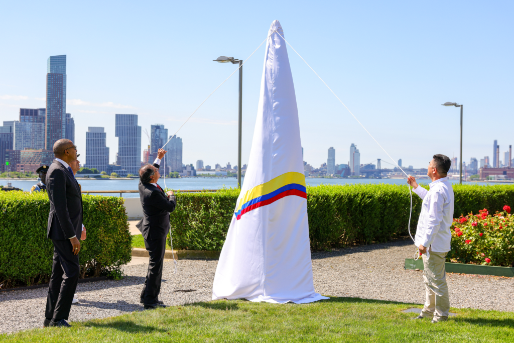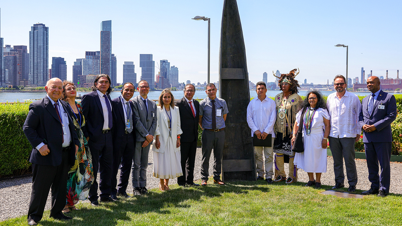 “Este monumento simboliza todo el sentido de nuestra lucha: dejar las armas para construir una sociedad sin violencia, con esperanza, justicia social y dignidad”, dijo Diego Ferney, firmante del acuerdo de paz, quien viajó a Nueva York por primera vez para expresar su agradecimiento a la comunidad internacional.