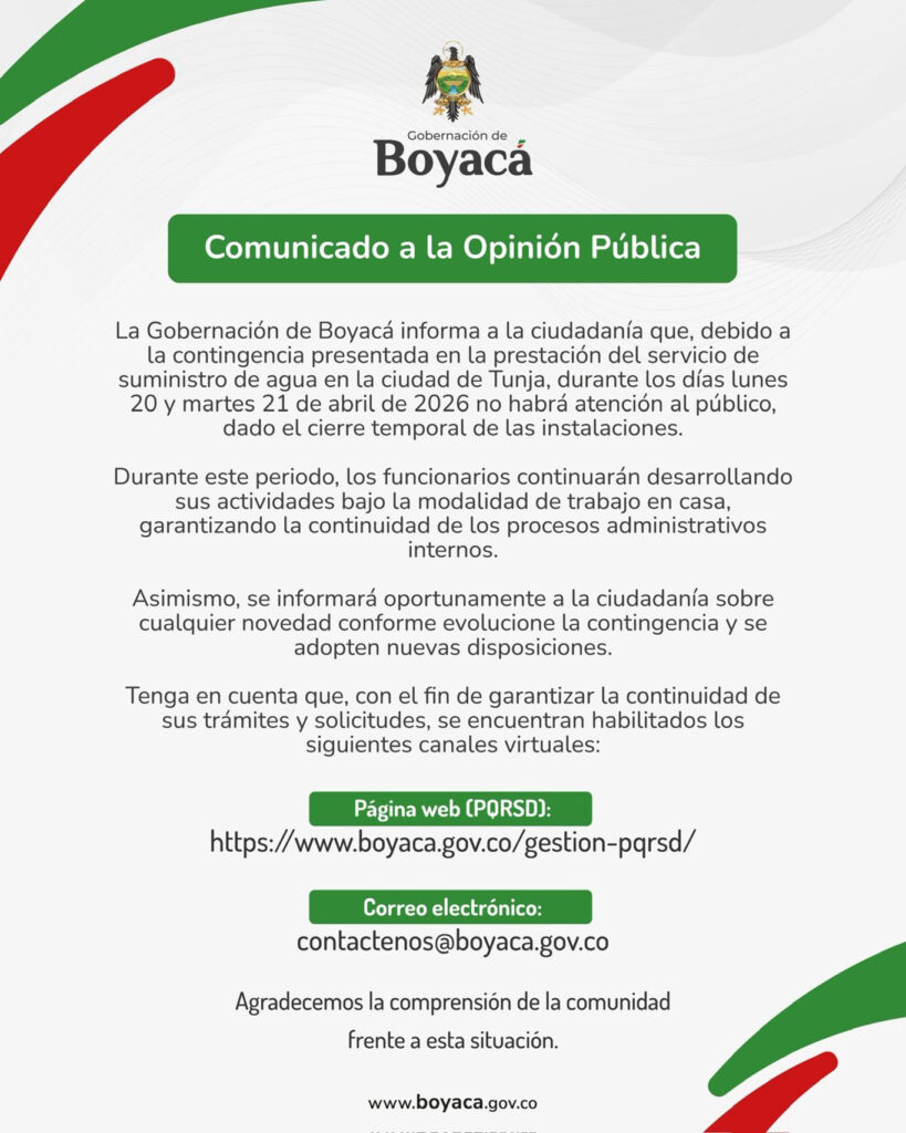La Oficina de Pasaportes de la Gobernación de Boyacá informa a la ciudadanía que, debido a la contingencia en el servicio de agua que se registra en el municipio de Tunja, no se prestará atención al público para agendamiento, trámites y entrega de pasaportes los días lunes 20 y martes 21 de abril.