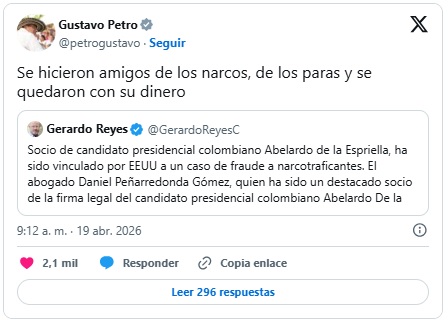 Daniel Peñarredonda Gómez, exsocio del candidato presidencial Abelardo de la Espriella y quien fuera su hombre de confianza en De la Espriella Lawyers, figura en un expediente de la corte federal de Tampa, Florida, como presunto «Coconspirador 1» en un proceso criminal contra el exinformante de la DEA y el FBI Jorge Luis Hernández Villazón, alias Boliche, según reveló Univision Noticias. El presidente Gustavo Petro compartió la investigación con el comentario: «Se hicieron amigos de los narcos, de los paras y se quedaron con su dinero».