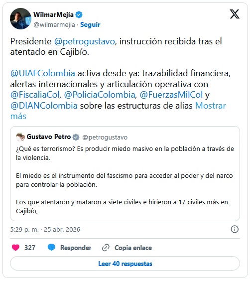 El director de la Unidad de Información y Análisis Financiero (UIAF), Wilmar Mejía, anunció nuevas medidas tras el atentado en Cajibío, Cauca, que dejó más de 15 muertos. Entre ellas se incluyen el fortalecimiento de la trazabilidad financiera y la articulación operativa con la Fiscalía para golpear las estructuras de alias “Marlon” e Iván Mordisco.